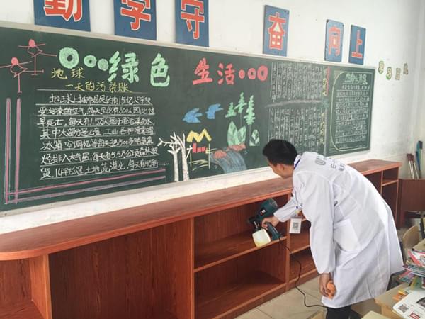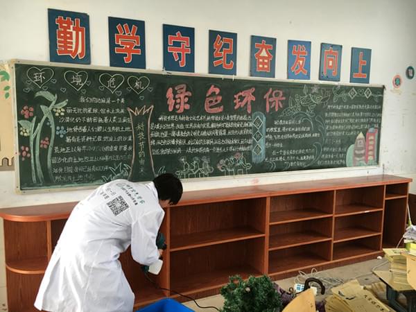我們發現教室的黑板報上學生寫的都是對綠色環保環境的強烈愿望!
