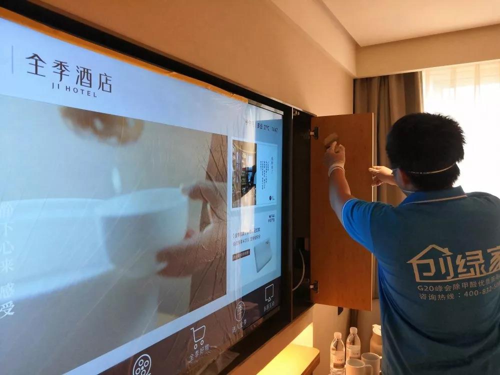 經(jīng)過檢測全季酒店室內(nèi)空氣不合格,就立馬找到除甲醛專業(yè)品牌創(chuàng)綠家環(huán)保,進(jìn)行室內(nèi)空氣治理,在施工人員幾個(gè)小時(shí)的治理下,辦公室空氣煥然一新,清新的空氣讓酒店方非常滿意。