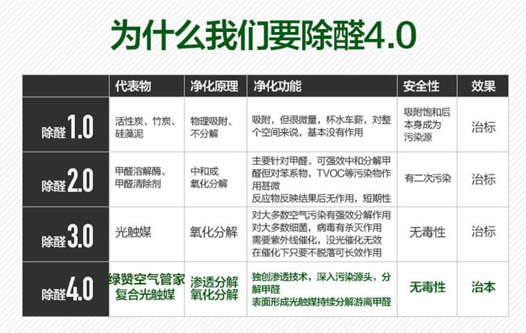 創綠家環保科技有限公司開創了全屋空氣環境治理4.0的新時代!!“綠贊空氣管家”采用復合納米光觸媒滲透技術,分類除醛,直擊源頭!一次除醛!長期有效!