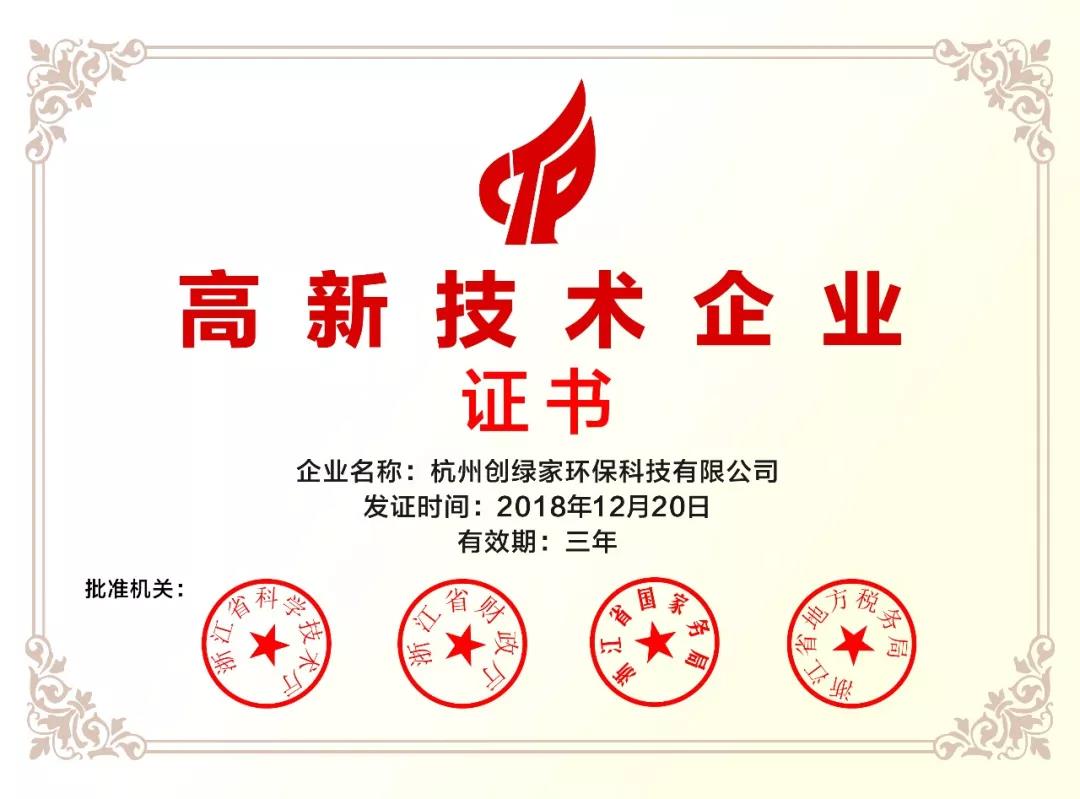 2018年12月,杭州創(chuàng)綠家環(huán)??萍加邢薰颈徽J(rèn)定為國(guó)家高新技術(shù)企業(yè)。