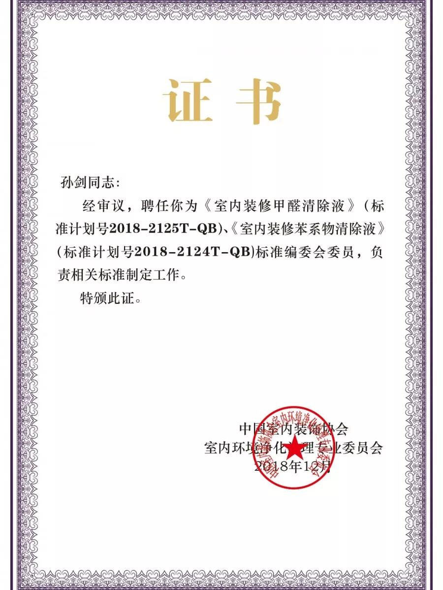 2018年12月19日,中國(guó)室內(nèi)環(huán)境凈化治理行業(yè)第五屆技術(shù)創(chuàng)新分享會(huì)在北京新聞大廈長(zhǎng)安發(fā)布廳舉行。創(chuàng)綠家環(huán)保成為《室內(nèi)裝修甲醛清除液》、《室內(nèi)裝修苯系物清除液》標(biāo)準(zhǔn)內(nèi)編制委員會(huì)正式成員,為標(biāo)準(zhǔn)主要起草單位之一,創(chuàng)綠家環(huán)??偛脤O劍被聘任為該標(biāo)準(zhǔn)編委會(huì)委員。