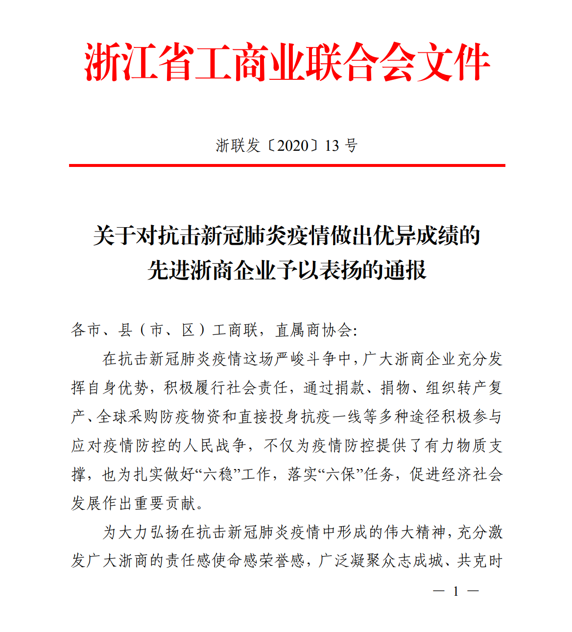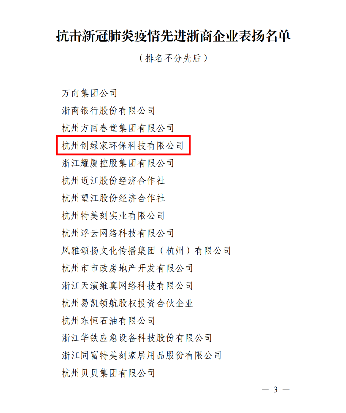 為大力弘揚在抗擊新冠肺炎疫情中形成的偉大精神,充分激發(fā)廣大浙商的責任感和使命感,近日,浙江省工商業(yè)聯(lián)合會發(fā)布了關于對抗擊新冠肺炎疫情做出優(yōu)異成績的先進浙商企業(yè)予以表揚的通報,杭州創(chuàng)綠家環(huán)保科技有限公司被評為“抗擊新冠肺炎疫情先進浙商企業(yè)”。